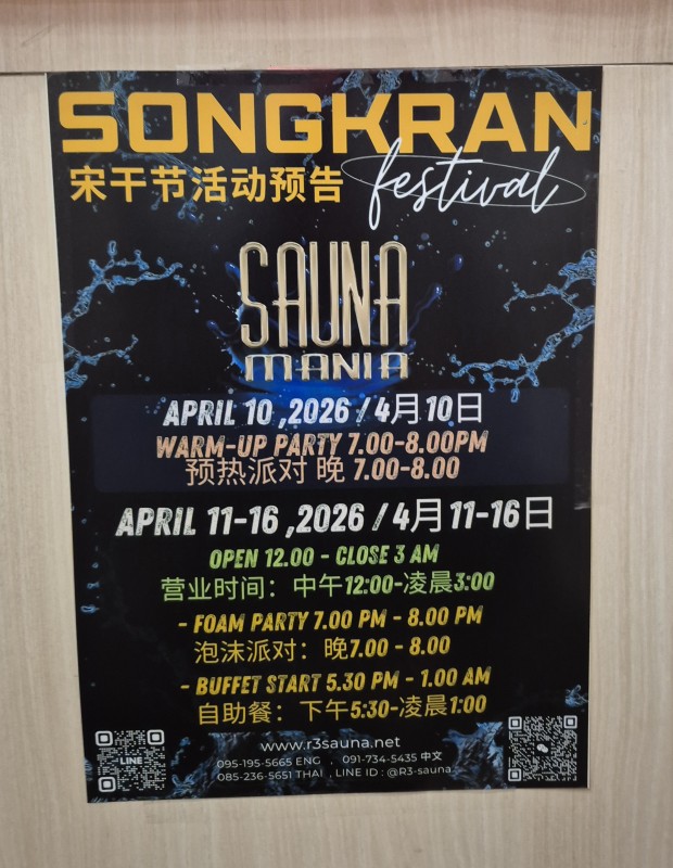 - ソンクランのお知らせが貼ってあった。ただ、受付の人が言っていたが、極めて混雑するとのこと。行くなら、かなり早めか、遅めかがいいと思う。最近のマニアは、年齢層が高い。特に、18,19時台は。遅くなると若い人も少しは増えるが、鍛えた人は全体的に少ない。あまり選り好みをしなければできると思う。