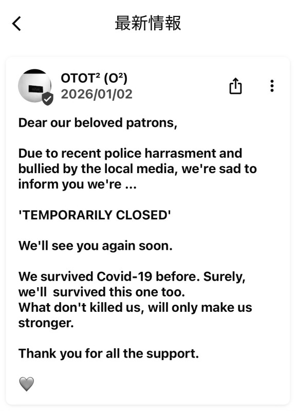 - 11月28日に警察が入り、その時に中に居た100人程の方々が拘束されたようです。地元ニュース等で報道されていました。マレーシアはイスラム教が原則な国なので、ハッテン場等の場所に行く際にはこういったリスクがあるという点は理解しておいた方が良いと改めて思いました。私自身マレーシア在住のゲイでハッテン場自体はマレーシア以外ではたまに行くことがありますが、こういう事が起こり得るので、マレーシア内では行かないようにしています。旅行者の方含め皆様もお気をつけください。